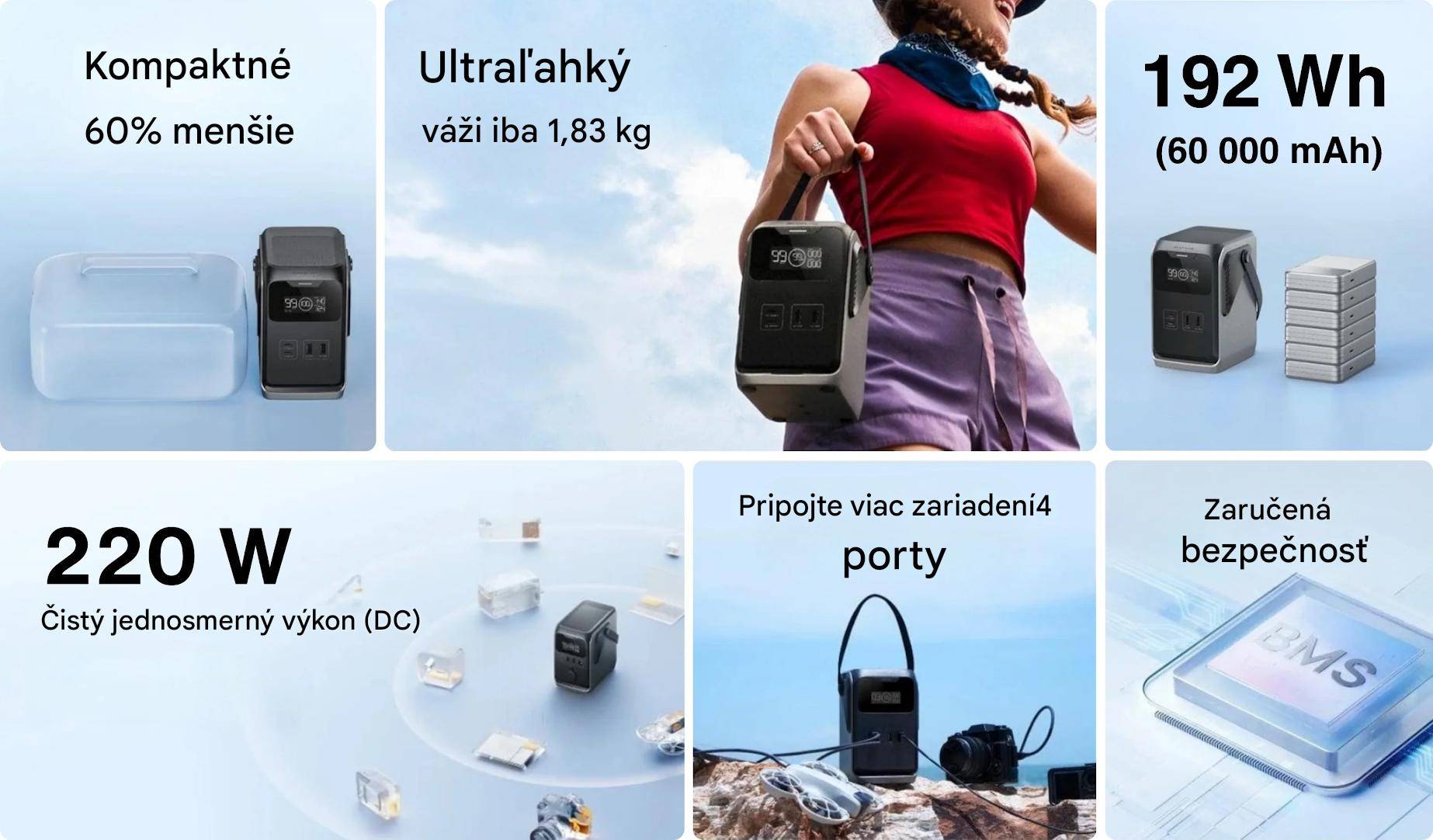 Táto kompaktná a ľahká batériová stanica s kapacitou 192 Wh a celkovým výkonom 220 W je ideálnym zdrojom energie na kempovanie, cestovanie, rybolov alebo organizovanie vonkajších podujatí. Dokáže napájať svetlá, kamery, tablety, reproduktory a ďalšie zariadenia. Vďaka odolnej konštrukcii a veľmi kompaktnému dizajnu sa ľahko prenáša a bez problémov sa zmestí aj do batohu. Viaceré výstupné porty umožňujú napájať súčasne viac zariadení.