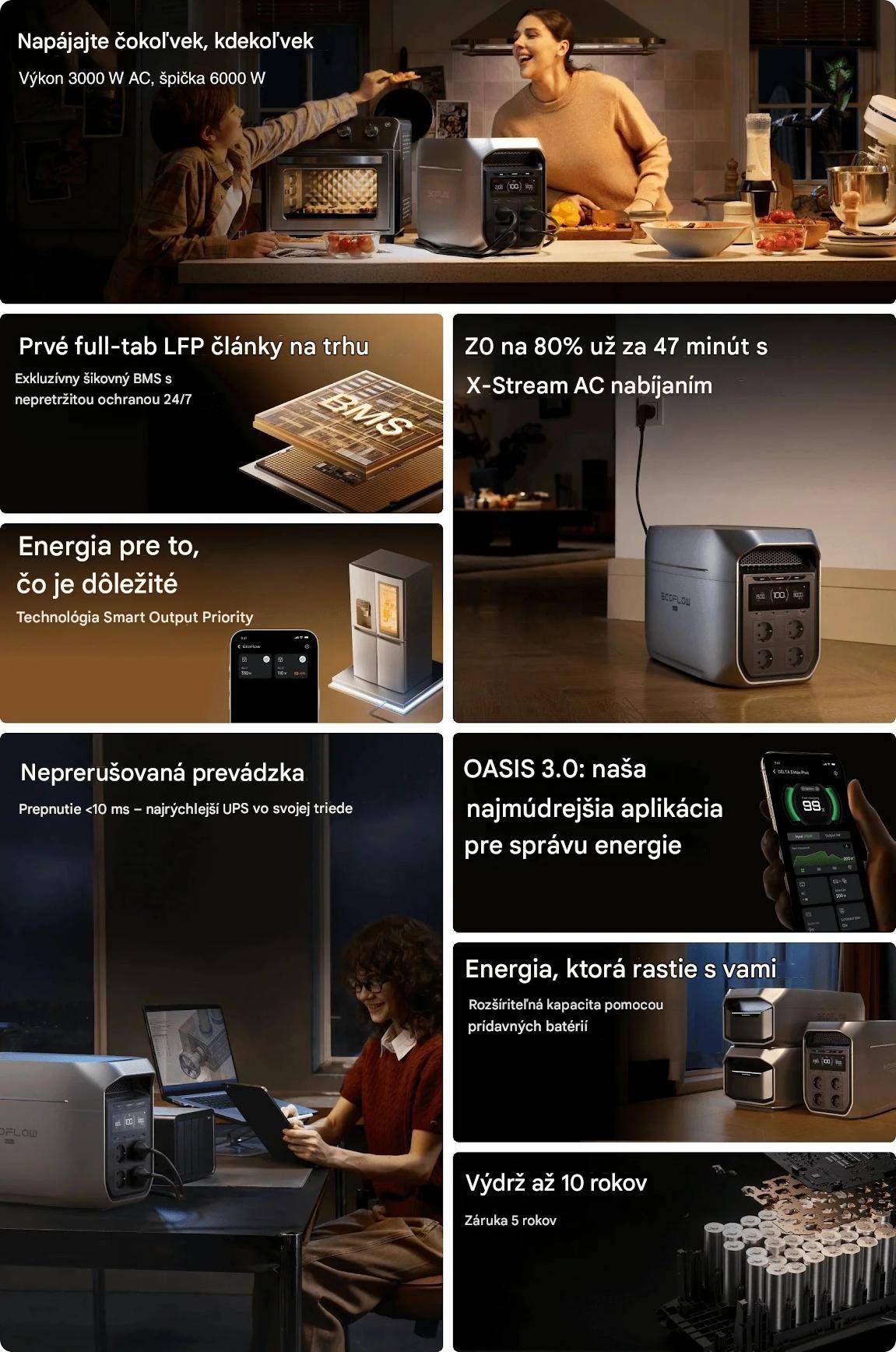 Prenosná batériová stanica ponúka menovitý výkon 3 000 W a špičkový výkon až 6 000 W. Vďaka technológii X-Boost dokáže napájať aj spotrebiče s príkonom až 3 900 W. Základnú kapacitu 2 048 Wh je možné rozšíriť pomocou prídavných batérií až na 10 kWh, čo umožňuje dlhodobé napájanie domácich spotrebičov aj výkonnejších pracovných nástrojov. Režim UPS s prepnutím do 10 ms zároveň zabezpečuje spoľahlivý záložný zdroj pri výpadkoch elektriny.